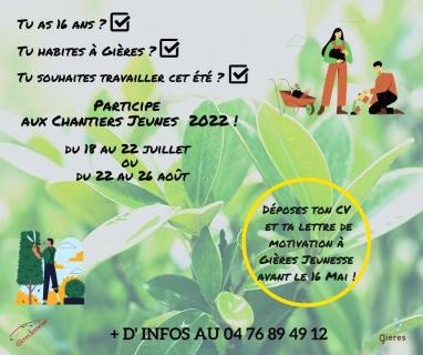 Dépose ta candidature à Gières Jeunesse avant le 16 mai (CV et lettre de motivation à l'attention de Johanna MACRI, Directrice).