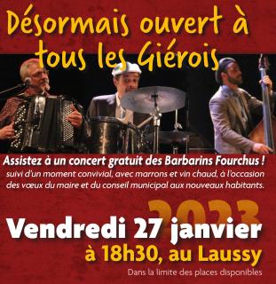 Vous avez été très nombreux à réserver vos places pour assister au concert du Trio du Kinkin (collectif des Barbarins Fourchus) et au moment convivial programmés dans le cadre de la cérémonie des voeux 2023. Nous sommes désormais au complet.