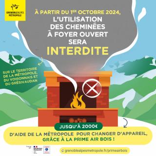 Au 1er octobre 2024, l’utilisation des cheminées à foyer ouvert sera interdite par arrêté préfectoral (communiqué de presse téléchargeable ci-contre) sur le territoire de la Métropole, du Voironnais et du Grésivaudan, sauf si elles sont équipées d’un dispositif d’amélioration du rendement et des émissions.