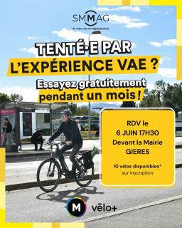 Mvélo+, service de location de vélo et de stationnement sécurisé du SMMAG (Syndicat Mixte des Mobilités de l’Aire Grenobloise) propose à 10 Giérois de louer gratuitement un vélo à assistance électrique (VAE) pendant un mois, du mardi 23 septembre au mardi 21 octobre 2025. Cette location a pour objectif de permettre aux habitants de Gières d’essayer un vélo à assistance électrique pour leurs déplacements du quotidien.
