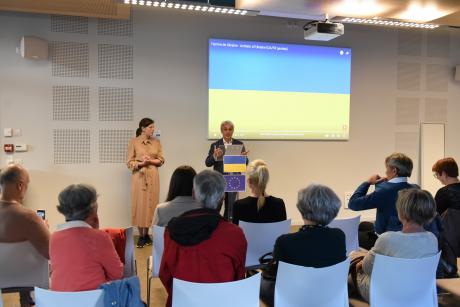 Avant la projection, le maire Pierre Verri a prononcé quelques mots (retrouvez son discours dans le fichier ci-joint) traduits spontanément par Jaroslava, Ukrainienne vivant en France depuis près de 5 années. L'hymne ukrainien a également été diffusé et une minute de silence a été observée en mémoire des victimes de la guerre en cours.