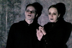Dracula est un spectacle sombre, en noir et blanc avec quelques fulgurances de rouge. Grâce au jeu des comédiens, au maquillage, masques, ombres chinoises, décors projetés, le livre de Bram Stoker nous fait frissonner de nouveau.