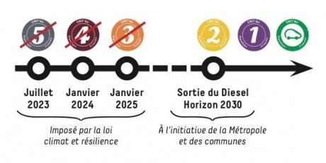 Les contraintes à venir imposées par la ZFE “tous véhicules” (voir les échéances sur l'illustration ci-dessus) ont incité la métropole à lancer une concertation, accessible ici jusqu'au vendredi 9 décembre, auprès des habitants des 13 communes concernées, dont Gières, dans un contexte où le coût de l’énergie frappe d’abord les plus vulnérables.