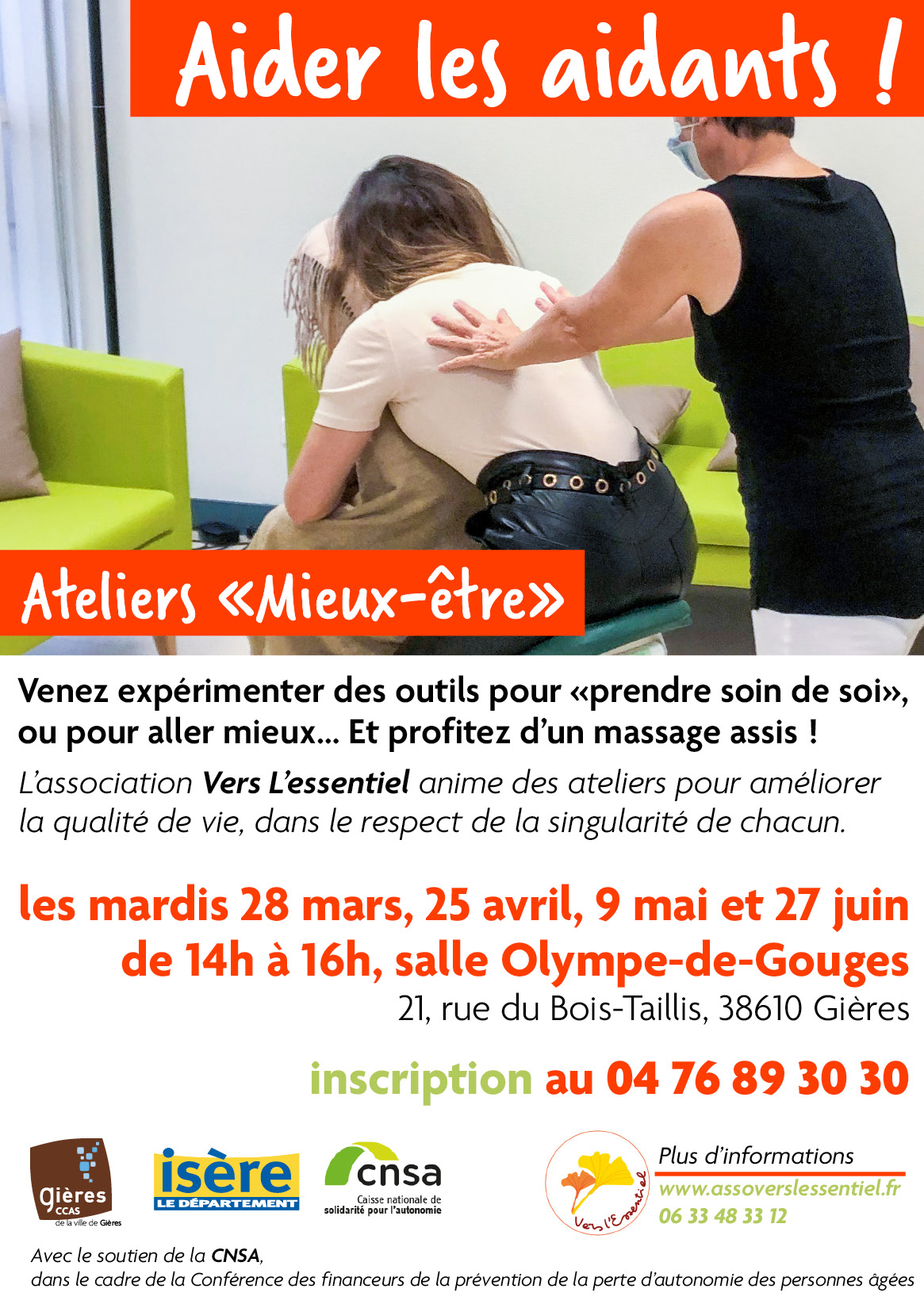Vous êtes aidant ? Venez expérimenter des outils pour prendre soin de soi, pour aller mieux... et profitez d’un massage assis! L’association Vers L’essentiel anime 4 ateliers au printemps 2023, un mardi après-midi par mois à l'espace Olympe-de-Gouges (21 rue du Bois-Taillis), pour améliorer la qualité de vie, dans le respect de la singularité de chacun.