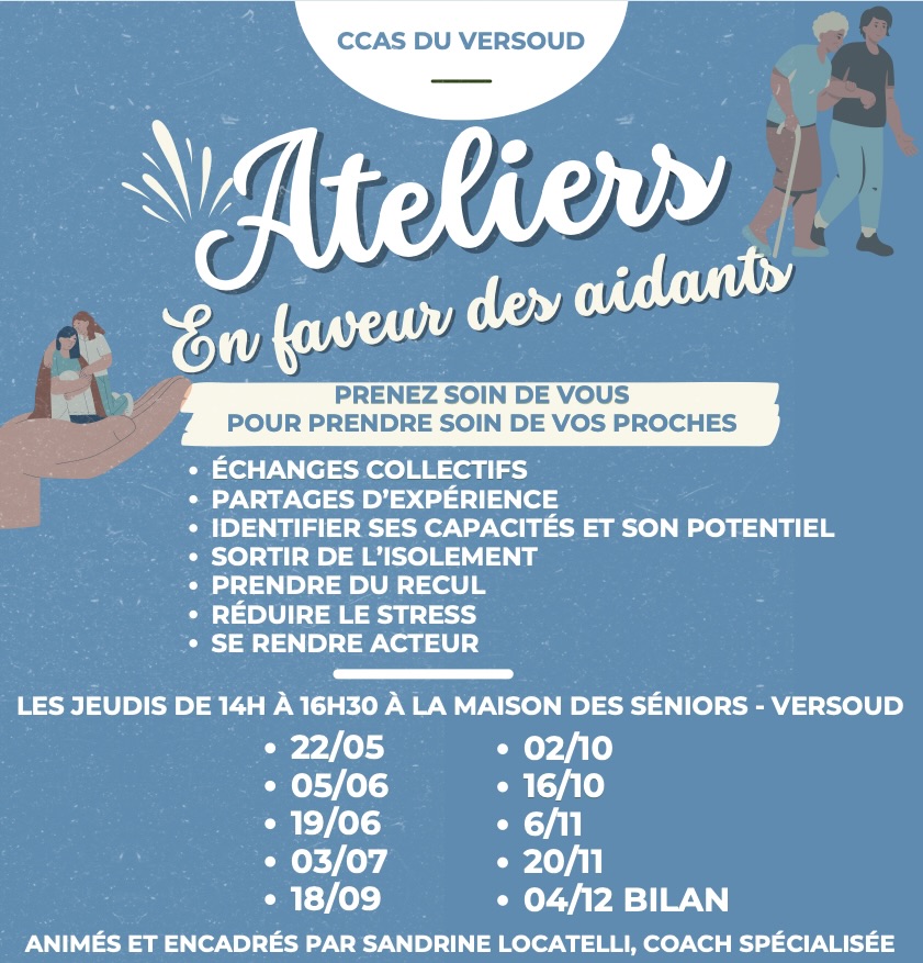 En collaboration avec la ville du Versoud, le CCAS de Gières propose 9 ateliers coaching qui ont pour but de prendre du recul sur sa posture d’aidant tout en identifiant ses capacités et son potentiel au travers d’échanges collectifs. Ces ateliers se dérouleront à la Meije, 30 place de l’Église au Versoud, un jeudi sur deux, de 14h à 16h30, à compter du jeudi 22 mai et jusqu’en décembre (pas d’ateliers pendant l'été). Ils sont gratuits, sur inscription auprès de Jeanne Barbier au 06 14 81 23 01.