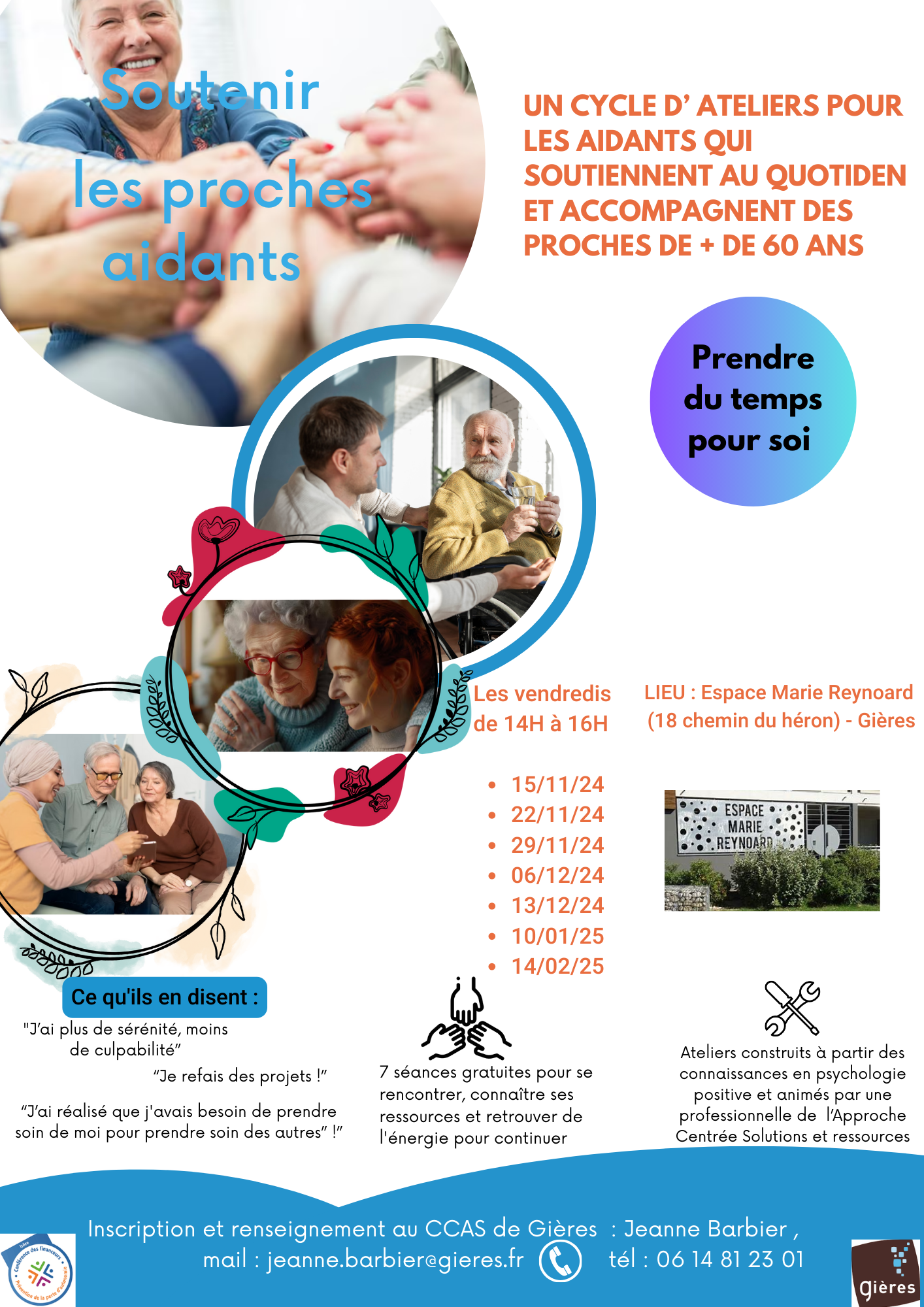 En supplément du Café des Aidants accueilli une fois par mois à Gières, le CCAS organise sept ateliers de novembre 2024 à février 2025 selon l’approche ACS (Approche Centrée Solution), une technique qui invite au changement de regard sur l’aidant, sur la personne accompagnée et sur la relation qui les relie tous les deux. Elle permet de se regarder au meilleur de soi-même, de renforcer ses compétences et ses ressources d’aidant et de se relier à ce que l’on souhaite plutôt qu’à ce qu’on ne souhaite pas. Le premier de ces ateliers aura lieu le vendredi 15 novembre, de 14h à 16h à l’espace Marie-Reynoard, c’est gratuit sur inscription au 06 14 81 23 01..