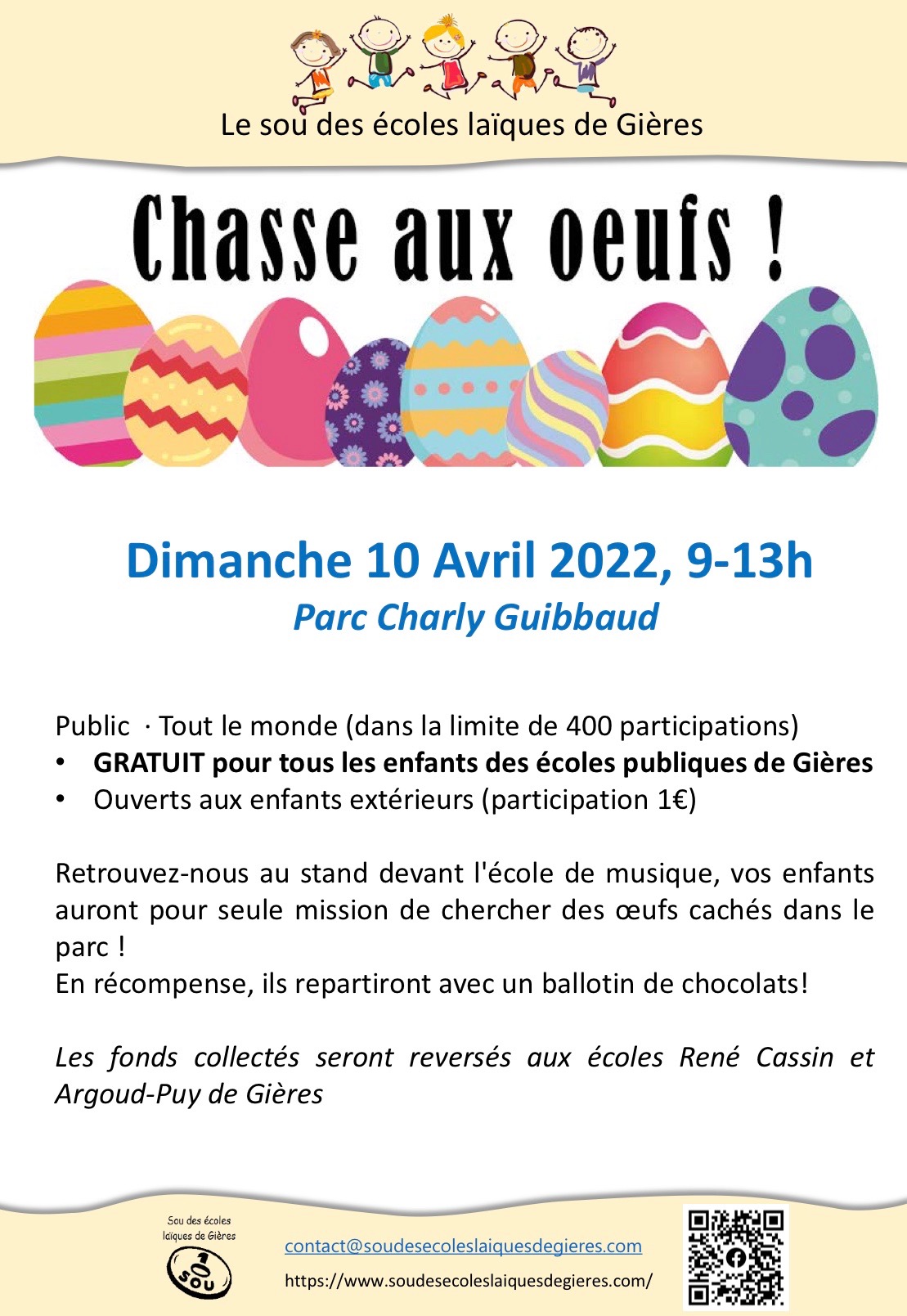 L'équipe du sou des écoles laïques de Gières organise une grande chasse aux oeufs, offerte (dans la limite de 400 participations) à tous les élèves des écoles publiques de Gières et aussi ouverts aux enfants extérieurs (en échange d'une participation de 1€), dans le Parc Charly-Guibbaud