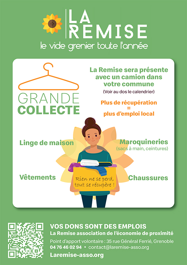 Les collectes de l'association d'insertion La Remise se déroulent les premiers vendredis des mois impairs (le vendredi suivant en cas de vacances scolaires), entre 13h30 et 15h30, toujours devant Gières Jeunesse, esplanade du 8-Mai-1945.