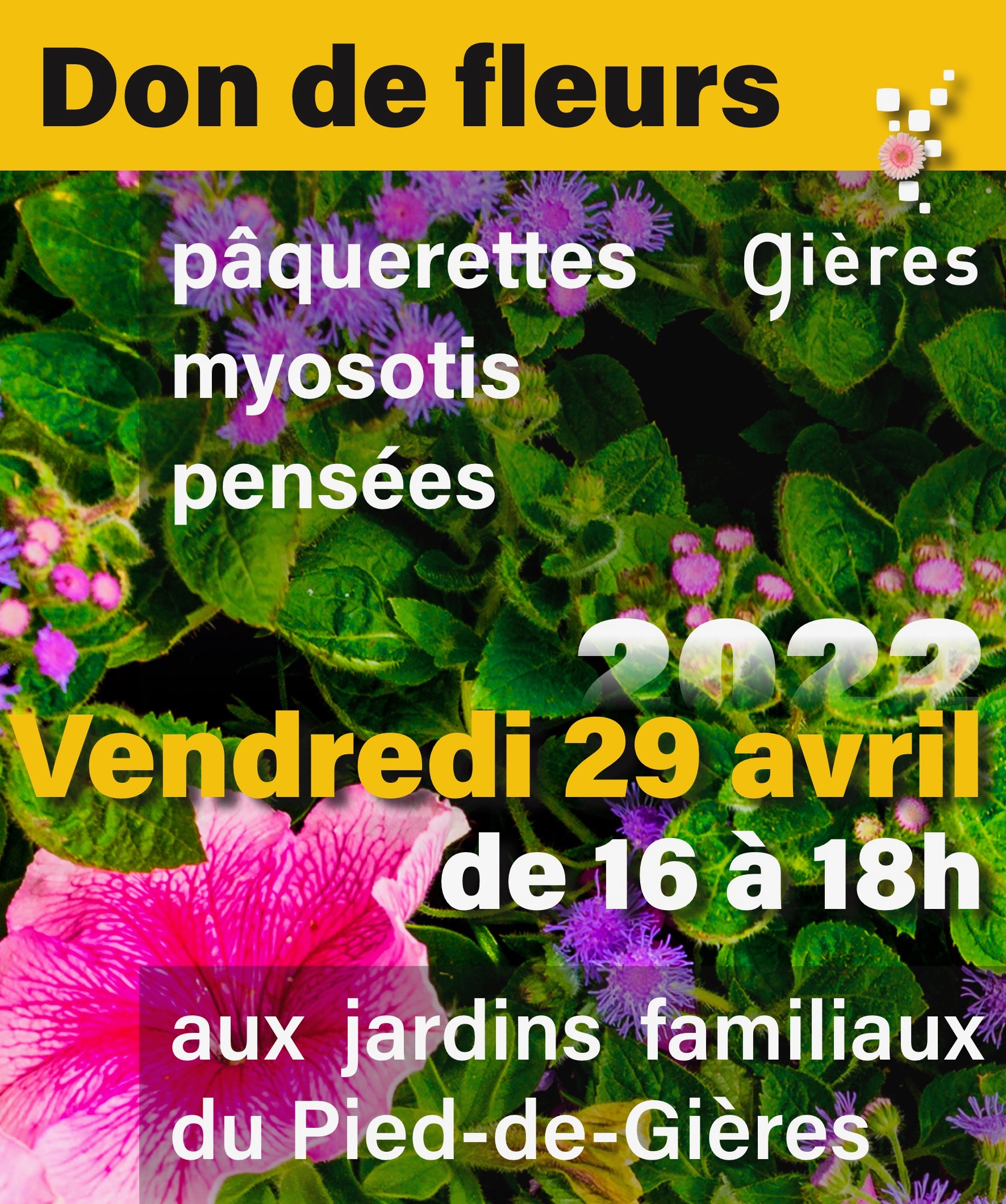 C'est le printemps ! Le service des espaces verts est sur le pont pour planter de nouveaux massifs de fleurs, mais il serais dommage de jeter celles qui ont réussi à traverser l'hiver. Les agents seront donc présents pour en faire don aux Giérois, qui pourront les replanter chez eux. Ça se passera au jardins familiaux du Pied-de-Gières (plaine de jeux du Japin, accès par la rue de la Fontaine).