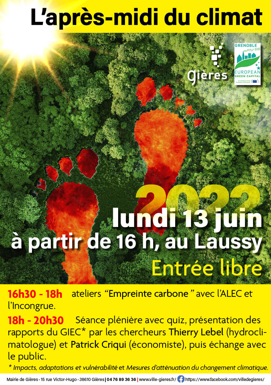 En préalable de l'après-midi du climat du lundi 13 juin, venez calculer votre empreinte carbone sur le marché de la place de la République, autour d'une boisson offerte au "Café du climat" de l'Incongrue. Vous pourrez ensuite la matérialiser sur la frise carbone des Giérois et tenter de gagner l'un des 3 emplaires de l'ouvrage Tout comprendre sur le climat (tirage au sort lundi 13 juin à 18h30).