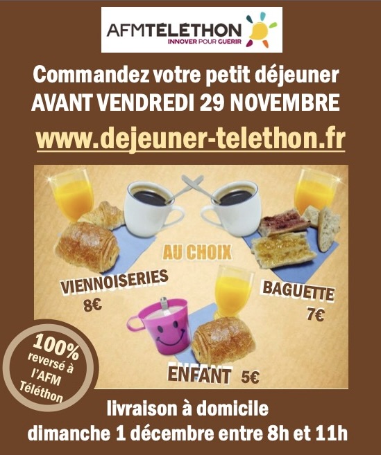Cécile et son équipe de bénévoles vous proposent, après réservation sur www.dejeuner-telethon.fr ou en déposant un bulletin papier chez les boulangers partenaires avant le vendredi 29/11, de vous livrer votre petit-déjeuner à domicile le dimanche 1er décembre.