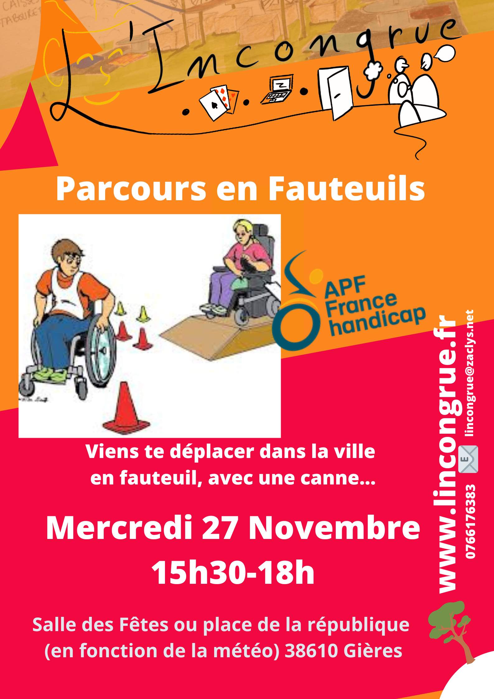 Dans le cadre du Mois de l'accessibilité et de la semaine des portes ouvertes des Tiers-lieux de l'Isère, L'Incongrue propose de se mettre dans la peau d'une PMR (Personne à Mobilité Réduite) avec un parcours en fauteuil et avec une canne les yeux bandés. En focntion de la météo, cette sensibilisation se déroulera place de la République ou à la salle des fêtes.