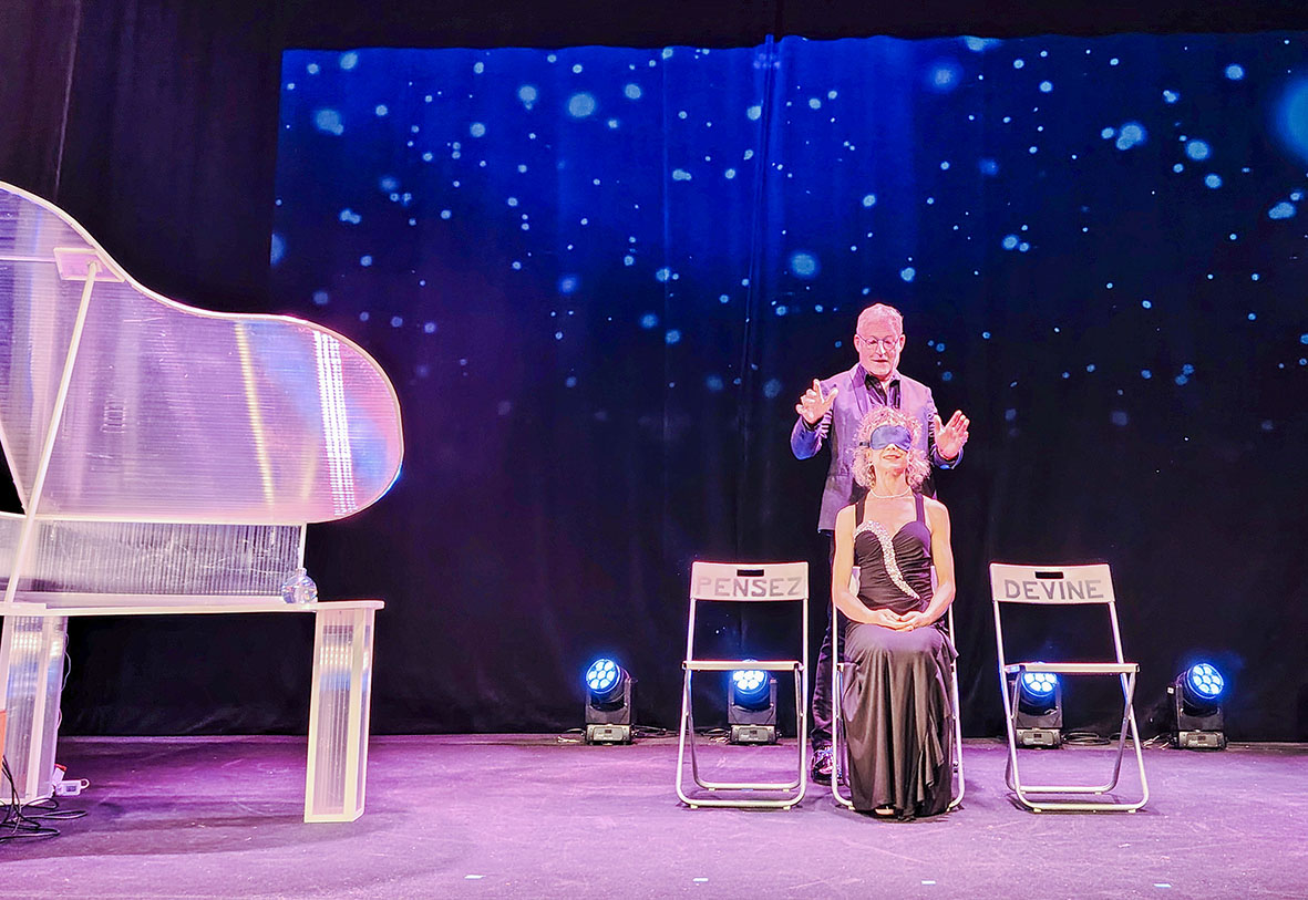 Miss Myriam, pianiste virtuose et télépathe espiègle, et Jean-Jacques Durand, mentaliste malicieux, vous embarqueront dans un spectacle aussi drôle que bluffant. Intuition, hypnose, échange de pensées en direct, tout devient possible avec humour et élégance.