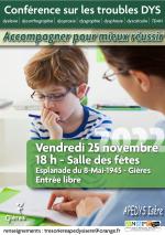 La salle des fêtes accueillera une conférence sur les troubles Dys (dyslexie, dysorthographie, dyspraxie, dysgraphie, dysphasie, dyscalculie, déficit de l’attention/hyperactivité) organisée par ANAPEDYS (Association nationale des adultes et parents d’enfants Dys), entrée libre (vendredi 25 novembre, à 18h)