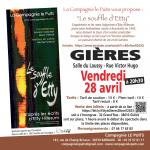 - À 20h30 — Un spectacle à découvrir et partager : Le Souffle d’Etty, qui met en vie et en lumière le témoignage d’Etty Hillesum. Une source d'inspiration pour l’Incongrue, car il nous invite à creuser notre relation à nous-mêmes, aux autres, au monde commun. C’est ce qu'elle s'efforce de faire à Gières : des rencontres déplaçantes qui permettent de construire un monde commun harmonieux, au delà des préjugés, des différences, des ressemblances... (Plein tarif, 10 € ; tarif de soutien, 15 € ; tarif réduit (- 18 ans), 8 € ; réservation directement sur https://bit.ly/EttyàGieres28avril2023, ou au local de l’Incongrue (28 Grand’rue) ou 1h avant le spectacle, dans la limite des places disponibles).