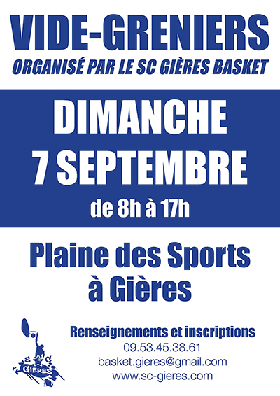 Le SC Gières organise la quatrième édition de son vide-greniers le dimanche 7 septembre 2014 de 8h à 17h sur le mail des Sports, à la Plaine des sports.