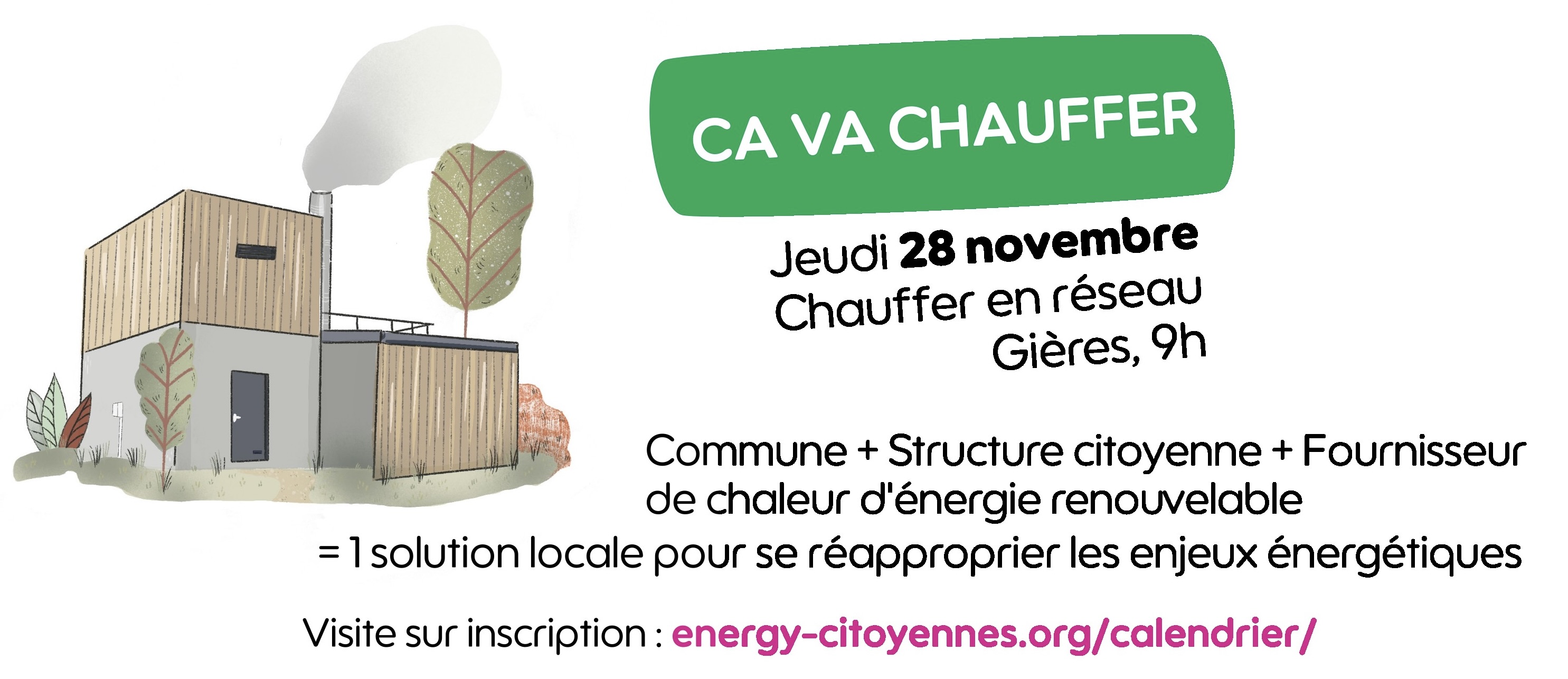 Des visites de chaufferies citoyennes avec réseaux de chaleur et d’une plateforme de préparation du bois en plaquette (à Charavines le samedi 23/11, départ à 10h en car de la gare routière de Grenoble) sont prévues afin de donner à voir les différents maillons et métiers impliqués entre la foret et le radiateur. A Gières, ce sera la chaufferie du clos d'Espiés, le jeudi 28/11 à partir de 9h, puis celle de Domène à partir de 14h. C’est ouvert à tous, gratuitement mais sur inscription, en suivant le lien pour connaitre tous les détails !