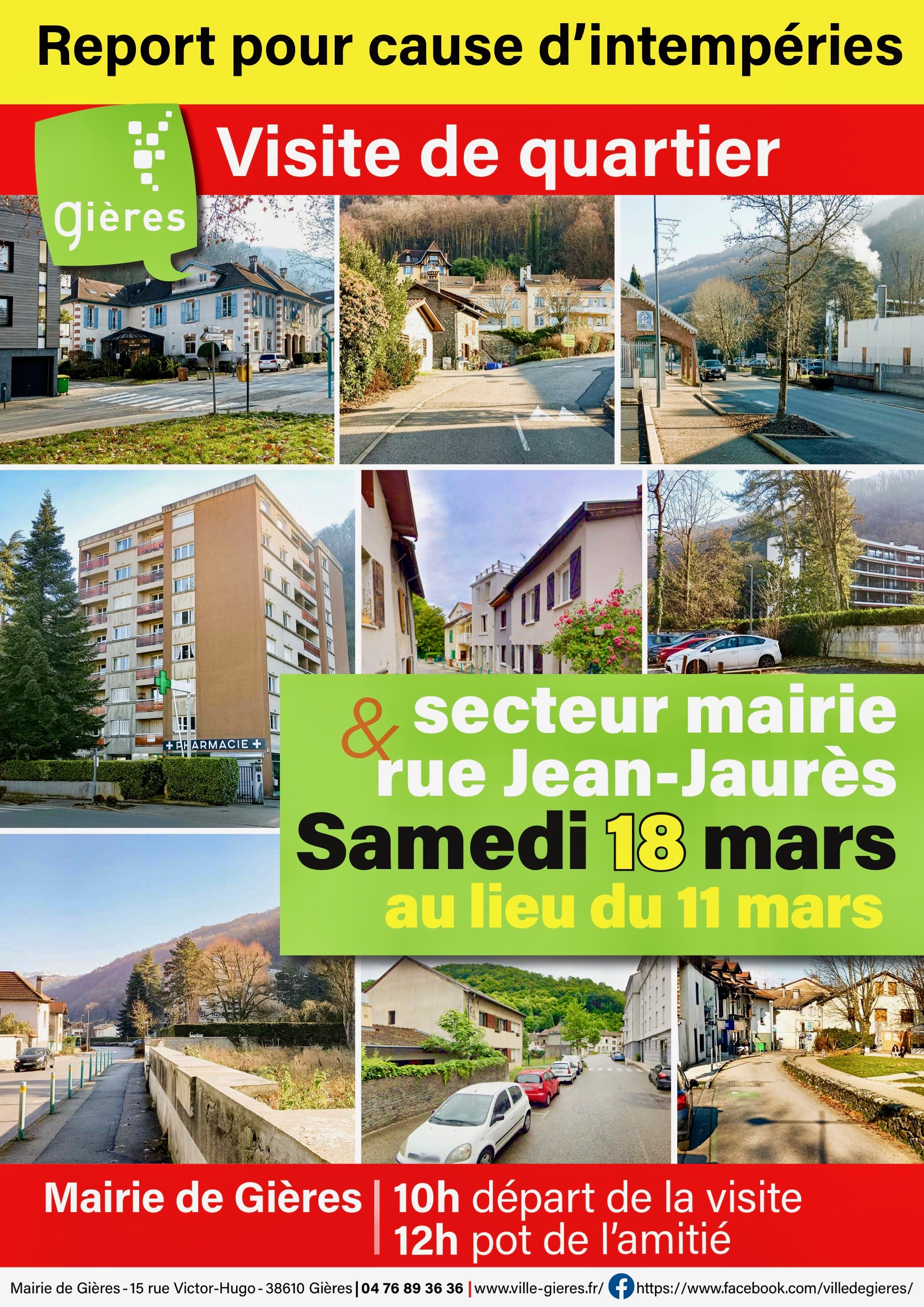 Initialement programmée le samedi 11 mars, la visite de quartier des secteurs mairie et rue Jean-Jaurès côté montagne est reportée d'une semaine pour cause d'intempéries.