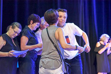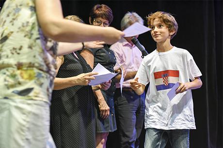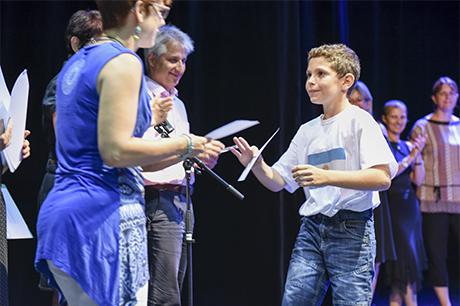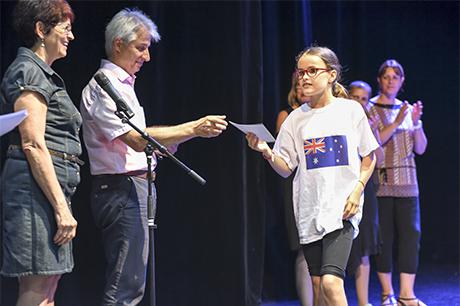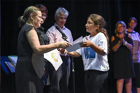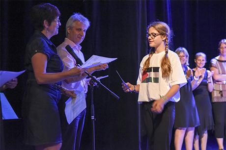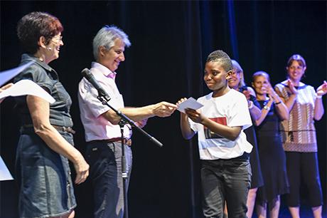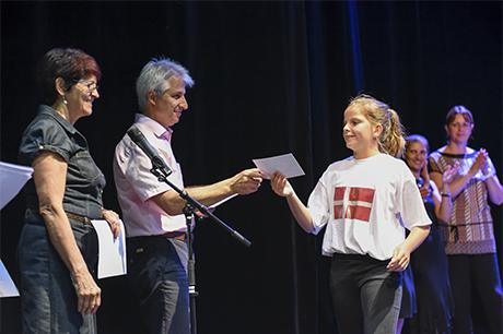 Mais ce n'est pas pour cette seule raison que les "presque collégiens" ont connu les honneurs du Laussy pour la réception de leur diplôme de fin de cycle, accompagné d'une invitation pour deux personnes à l'un des spectacles de la saison culturelle 2017-2018 ; la municipalité a voulu associer cette cérémonie au concert choral donné par ces deux classes, sous la direction de Claire Mazen, monitrice municipale d'éducation musicale en milieu scolaire ; c'était d'ailleurs aussi un bel hommage rendu à Claire, qui enseigne depuis presque 30 ans le chant et la musique dans les écoles de Gières.