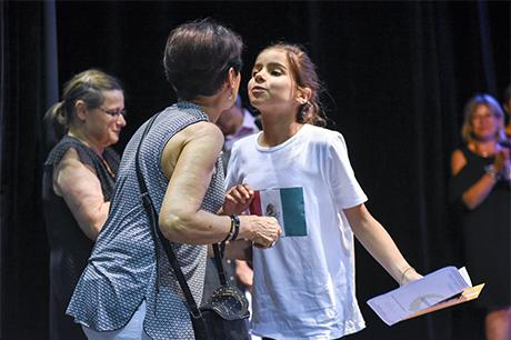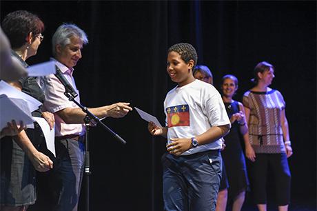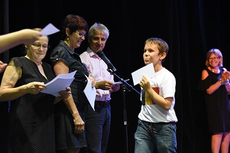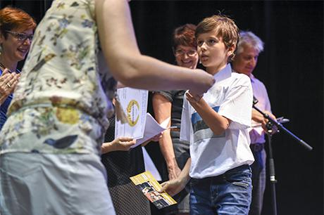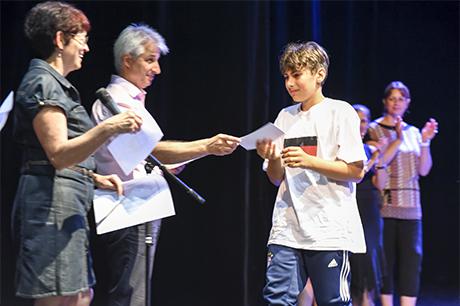 En cette fin d'année scolaire, la scène du Laussy a accueilli les élèves des deux classes de CM2 de l'école élémentaire René-Cassin pour célébrer leur fin de cycle en élémentaire avant leur rentrée prochaine au collège. Un rituel de passage coutumier des Giérois, puisqu'institué au lendemain des élections municipales de 2008 et partie intégrante d'un dispositif plus vaste connu sous le nom de "parcours citoyen" (voir les "3 questions à Jean Pavan” dans notre Dossier "Education à la citoyenneté“ du Gières info n°409 de mars/avril 2017, disponible sur ce site dans la rubrique “publications“), mais qui se déroulait jusqu'ici dans une salle des mariages bien étriquée pour l'occasion.