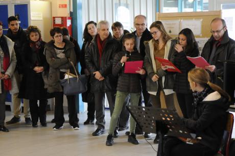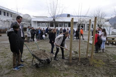 Les discours du principal et du maire de Gières sur les valeurs de la République, portées par la devise “Liberté, égalité, fraternité”, ont été suivis de quelques slams puis de choeurs d’élèves, qui ont interprété la Ballade Nord Irlandaise et l’hymne des Enfoirés, Attention au départ. Clément, un élève, a ensuite dévoilé la devise républicaine, désormais inscrite en belles lettres cursives au fronton de l’établissement, avant d’aider Lise et Julie à planter dans la cour l’arbre de la liberté, un cerisier.