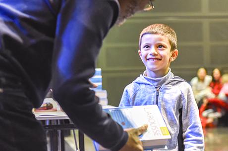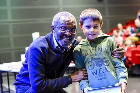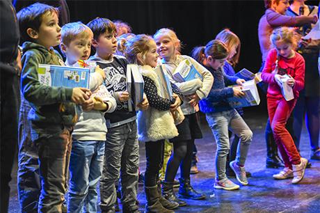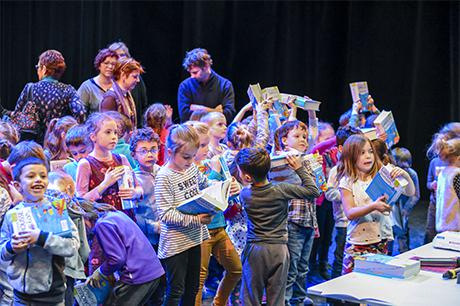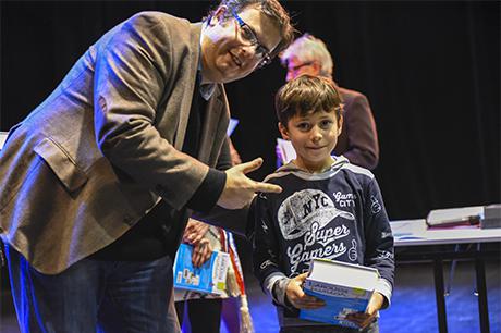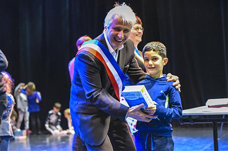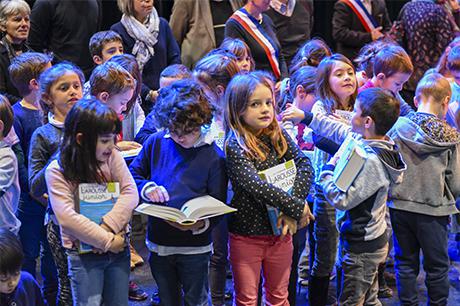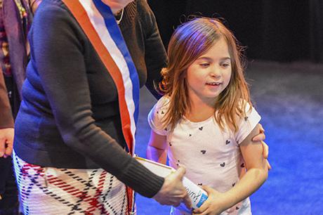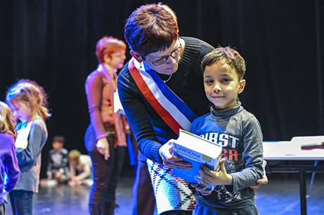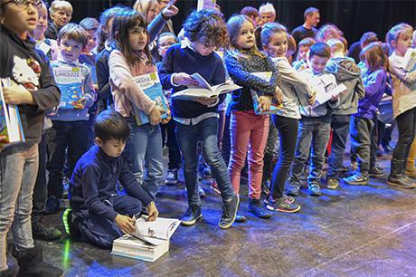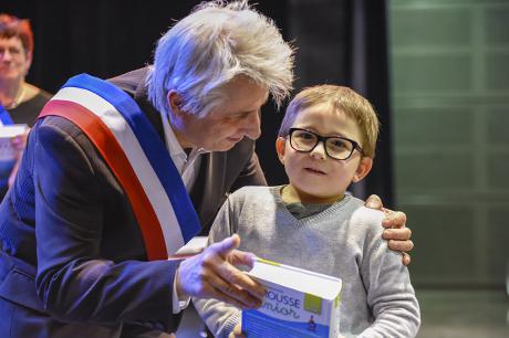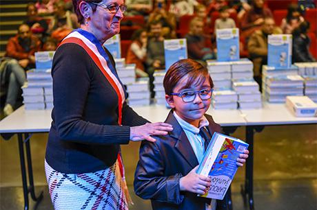 Premier acte du “parcours citoyen” mis en place par la commune depuis tout juste dix ans, au lendemain des élections municipales de 2008, la cérémonie de remise de dictionnaires aux élèves de CP a investi cette année la scène du Laussy, lieu autrement plus adapté que la salle des mariages à recevoir trois classes, soit près de 90 enfants, leur trois instituteurs (Nathalie Durand, Yann Tognet et Sylvain Vergeau, accompagnés de leur directrice Sandrine Contamin) et les parents, lesquels n'auraient raté cette invitation pour rien au monde !