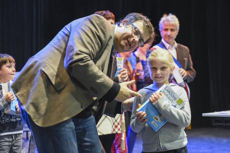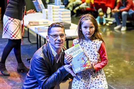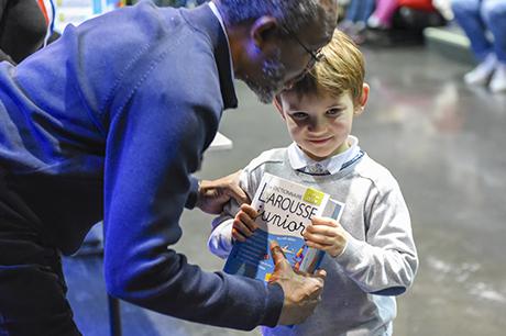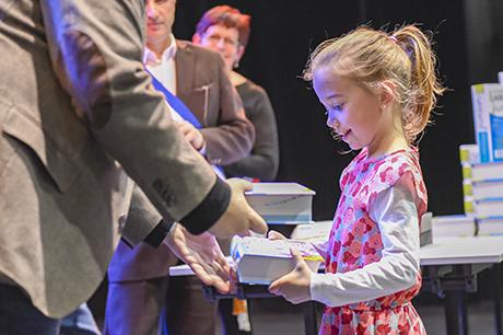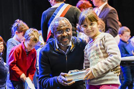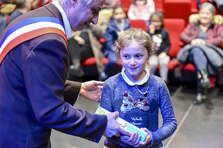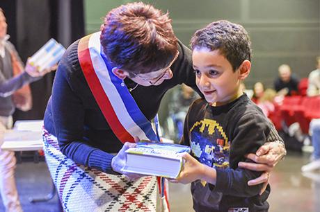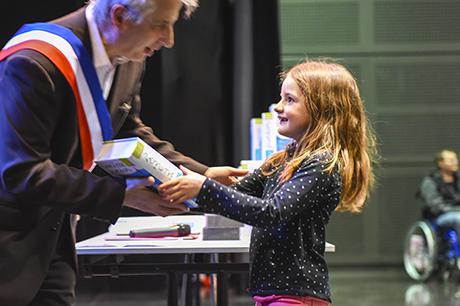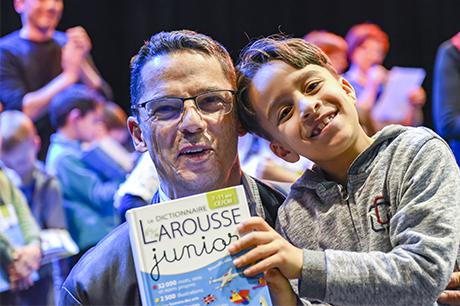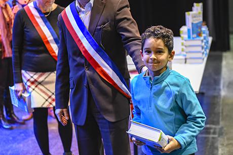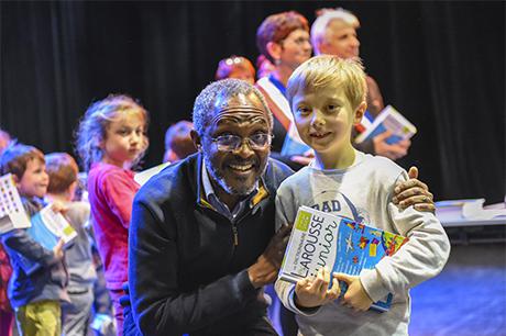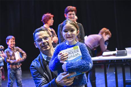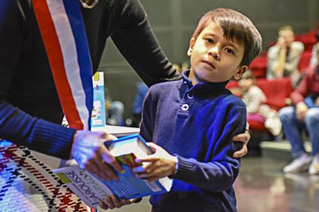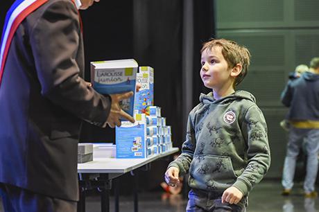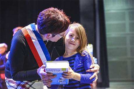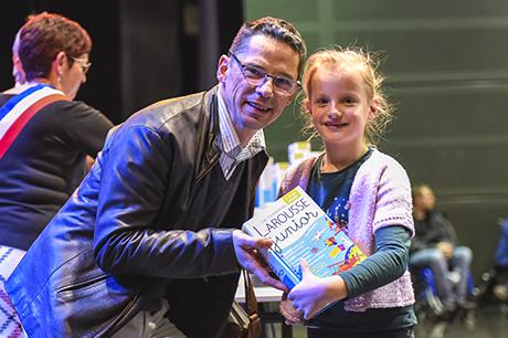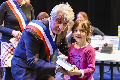 Pour bien faire comprendre aux élèves la solennité du moment, Pierre Verri et Christine Picca, respectivement maire et élue à l'éducation, avaient revétu leur écharpe tricolore et ont procédé à un petit quizz de vocabulaire tiré dudit dictionnaire, avant d'appeler les enfants chacun à leur tour pour leur remettre, en compagnie d'autres élus (Rahim Bah, Thierry Barral, Daniel Finazzo et Gisèle Le Cloarec), l'imposant ouvrage.